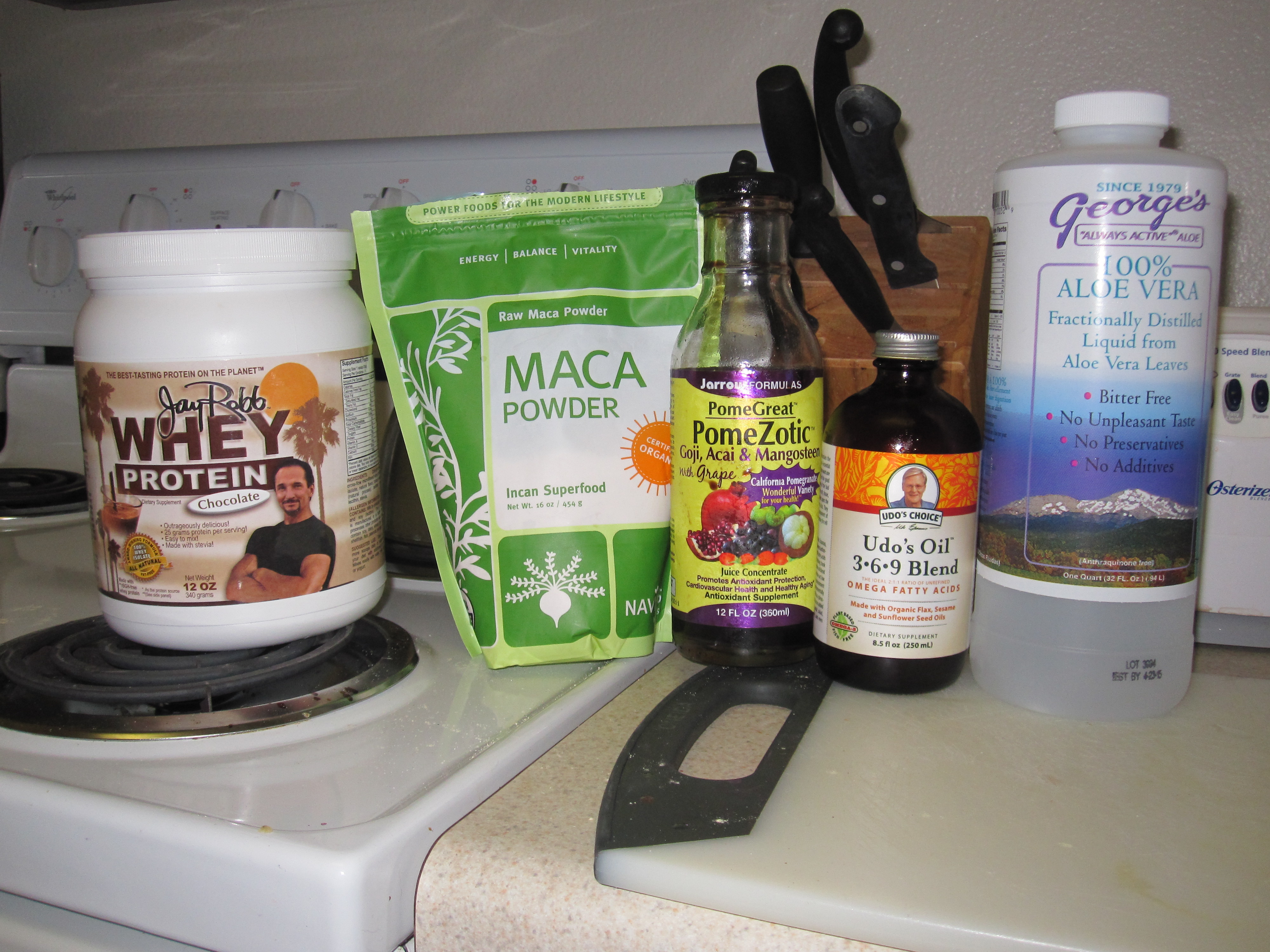 Whey Isolate Protein Shake w/ MACA, Organic Berries, Banana, ACAIAloe Vera Juice, & Udo’s Oil (available @ Wholefoods in liquid or pill form. Keep in Frig.)